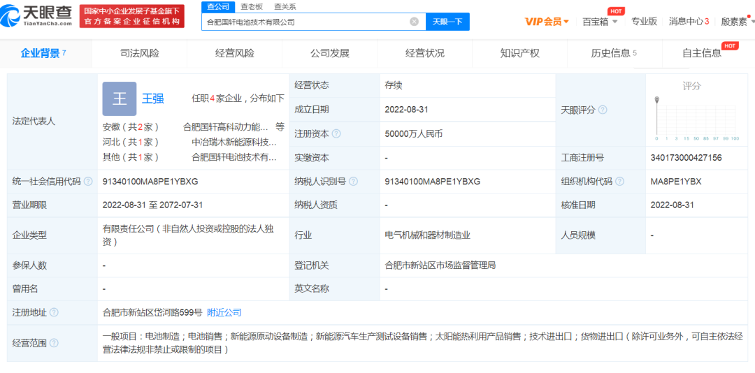 9月8日消息,近日,天眼查App显示,合肥国轩电池技术有限公司成立,注册资本5亿人民币。经营范围包括:电池制造、电池销售、新能源原动设备制造、新能源汽车生产测试设备销售、太阳能热利用产品销售等。据悉,该公司由股份有限公司间接全资控股。