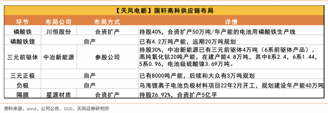 其实,最早在2007年,国轩就开始谋划建设材料基地。目前,从正负极到隔膜,国轩版图持续扩张,部分原材料已实现自供,剩余部分也通过合资/参股与上游企业达成合作。