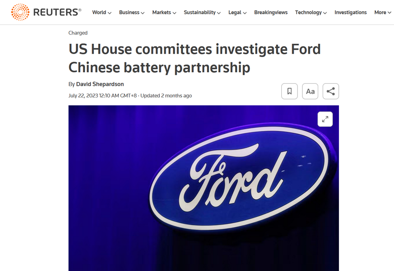 今年7月份,外媒报道称宁德时代与福特的合作正面临美国众议院的审查。