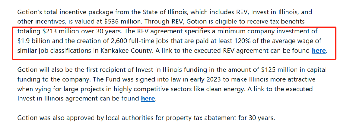 比如伊利诺伊州就要求国轩高科在当地的投资额至少要达到19亿美元、创造的全职工作岗位不少于2600个且工资水平不得低于坎卡基县同类岗位平均工资的120%。