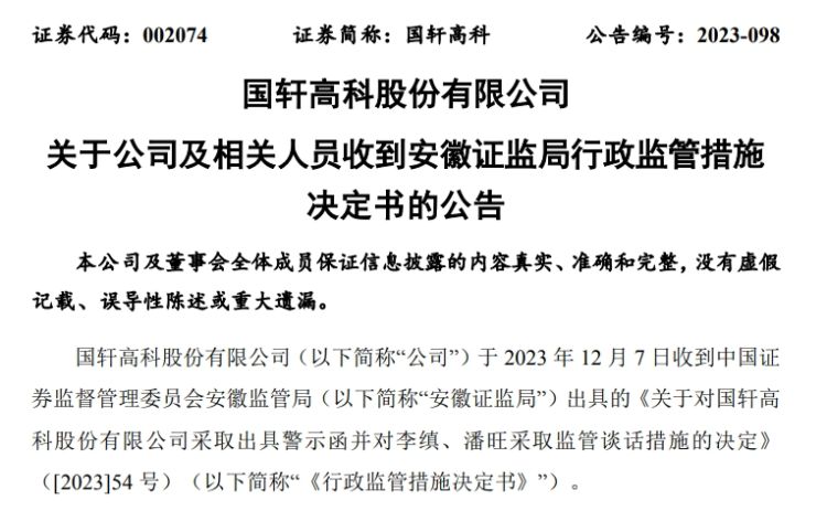 国轩高科(002074)12月8日晚间公告,公司收到安徽证监局出具的《行政监管措施决定书》。