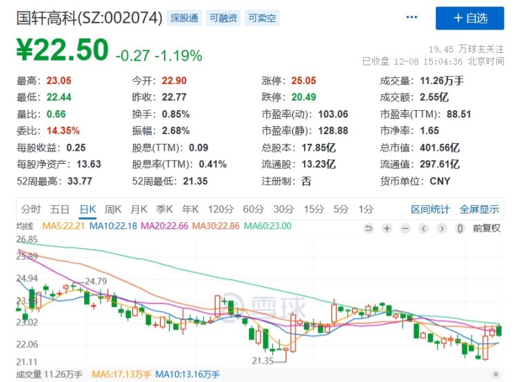 近期国轩高科股价整体走低,截至8日收盘跌1.19%,报22.50元。