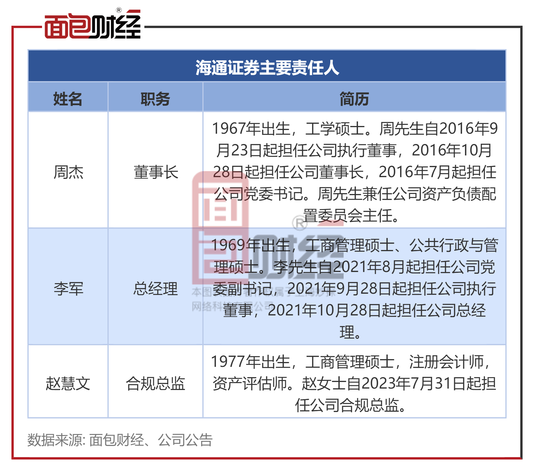 公开资料显示,海通证券董事长为周杰、总经理为李军、合规总监为赵慧文。