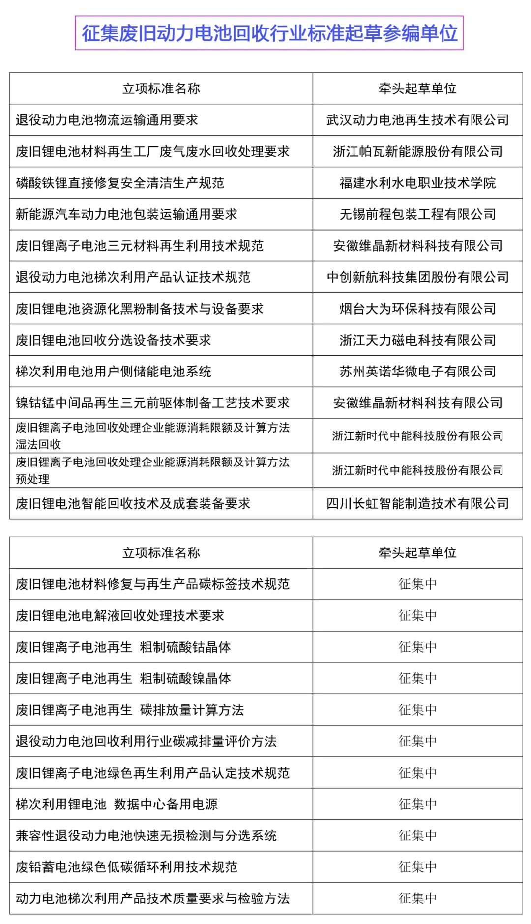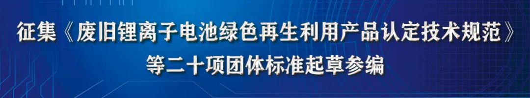 为贯彻落实《中华人民共和国标准化法》、国务院《深化标准化改革方案》、国家标准化管理委员会和民政部发布的《团体标准管理规定》(国标委联【2019】1号)等文件精神,加强行业标准体系建设,提升团体标准对市场发展的技术支撑和基础保障水平。废旧锂电池是宝贵的“城市矿山”,退役动力电池绿色再生和梯次利用是保障报废动力电池材料高效回收与循环利用的重要基础。由中国电子节能技术协会电池回收利用专业委员会组织的《废旧锂离子电池三元材料再生利用技术规范》、《废旧锂离子电池再生粗制硫酸钴晶体》等多项团体标准,现面向相关行业征集标准起草单位。