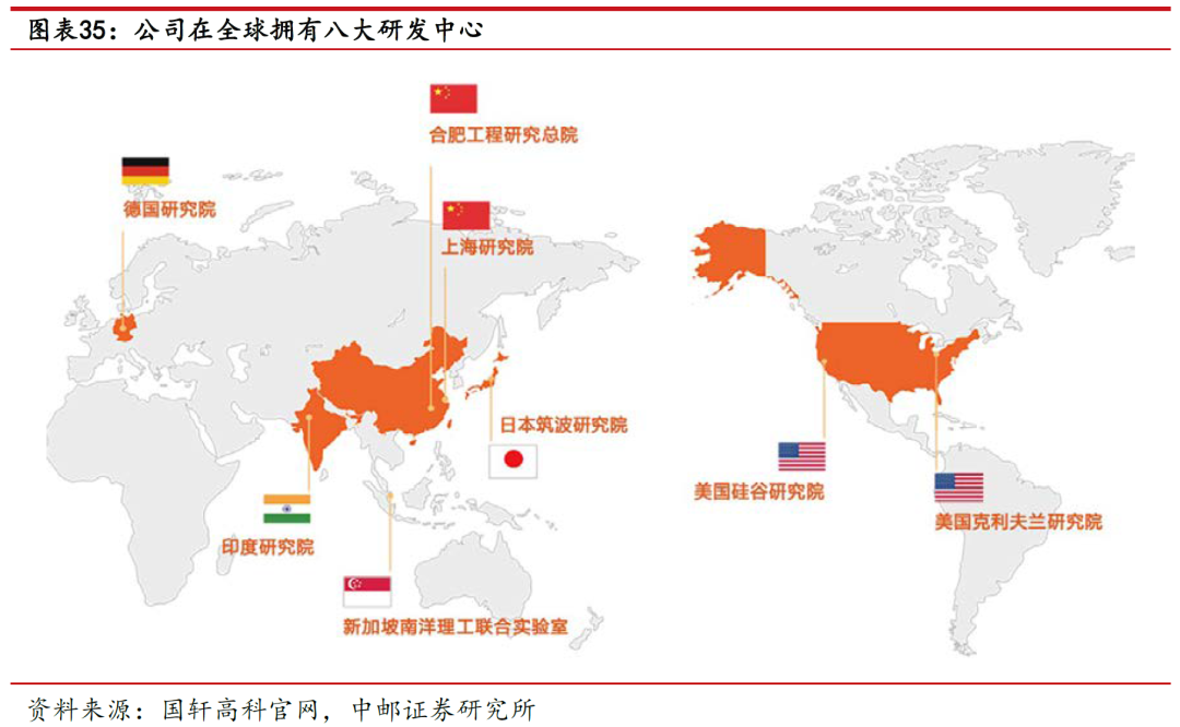 公司在全球拥有八大研发中心。国轩高科目前在中国合肥、中国上海、美国硅谷、美国克利夫兰、日本筑波、新加坡、欧洲德国、印度浦那(筹)等地建立了全球八大研发中心。研发领域覆盖了电池全生命周期,研发水平居行业领先地位。是集电池产品开发、材料体系开发、生产技术服务、检测验证及信息管理于一体的研发中心。现有研发技术人员超3000人,其中硕博士占比70%。