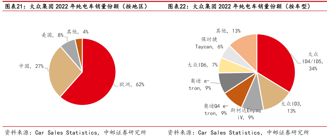 中欧是大众纯电车销量的主要市场,大众ID和奥迪e-tron是现有热卖车型。从2022年大众集团的纯电车地区销量情况来看,欧洲(占62%)和中国(27%)是最大的两个市场。现有的热销车型主要包括大众ID系列和奥迪 e-tron系列。
