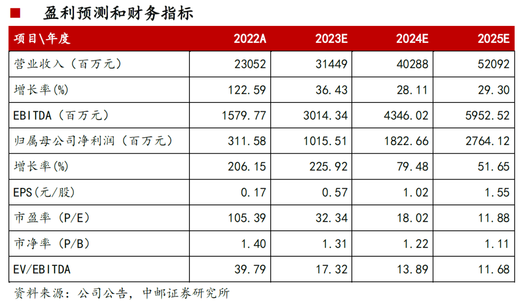 2023-2025年,我们预计公司有望实现营业收入314.49/402.88/520.92亿元,同比增长36.43%/28.11%/29.30%;有望实现归母净利润10.16/18.23/27.64亿元,同比增长225.92%/79.48%/51.65%;对应PE估值分别为32.34/18.02/11.88倍,首次覆盖,给予“增持”评级。