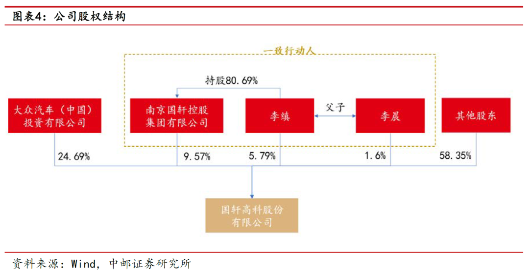 大众是公司的第一大股东,董事长李缜是公司实际控制人。2020年5月,双方签署股权合作协议,大众汽车(中国)投资有限公司投资约11亿欧元,获得国轩高科(当时)26.47%的股份,并成为其大股东。截至2023年三季报数据,大众持股比例为24.69%,是公司第一大股东。董事长李缜、南京国轩控股、李晨三者为一致行动人,李晨为董事长李缜之子。由于此前大众入股时,有约定协议“大众中国承诺,自本次非公开发行和股份转让涉及的公司相关股份均登记至大众中国名下起36个月内或大众自行决定的更长期间内,其将不可撤销地放弃其持有的部分公司股份的表决权,以使大众中国的表决权比例比创始股东方的表决权比例低至少5%”,董事长李缜仍是公司的实际控制人。在引入大众、优化资本结构的同时,并未牺牲公司原高层的主导权,股权架构稳定。