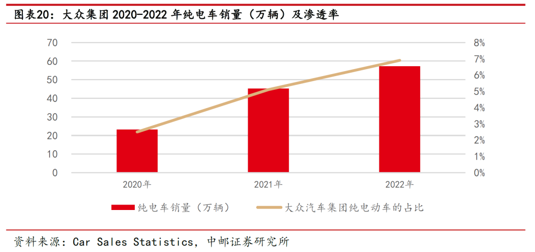 2022年大众集团纯电车的渗透率约7%,转型序幕已悄然拉开。2020/2021/2022年,大众集团纯电车的销量分别为23/45/57万辆,占集团总销量的比例分别为2.5%/5.1%/6.9%。由于汽车平台架构的设计等等需要时间,2030 NEW AUTO战略也是在2021年发布,我们认为现在大众集团的电动化转型刚刚正式拉开序幕,从目前7%的渗透率到2030年50%的渗透率的变化过程非常值得期待。