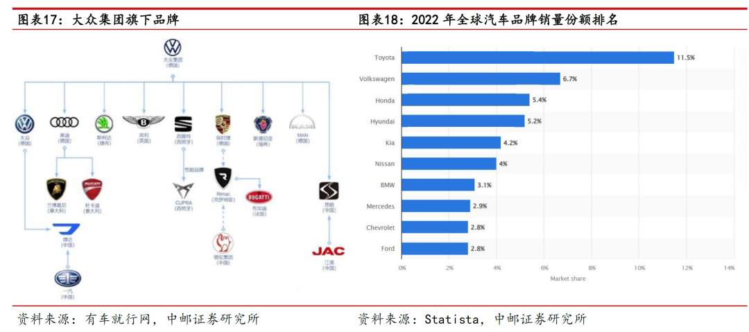大众集团是全球家喻户晓的汽车集团,旗下拥有诸多品牌,其中大众汽车位列全球汽车品牌市场份额第二。先来了解一下大众集团:作为燃油车时代家喻户晓的汽车集团,其旗下拥有诸多品牌,包括大众汽车、奥迪、斯柯达、宾利、兰博基地、保时捷等多款广为人知的汽车品牌。就单一品牌的市占率来看,2022年,全球所有汽车品牌销量排名中,大众集团同名的汽车品牌大众汽车排名全球第二,市场份额6.7%,仅次于丰田。