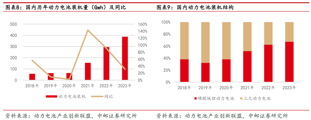 新能源车销量爆发带动动力电池出货需求高增。动力电池市场规模随着下游新能源需求的爆发迎来高速增长。2018-2023年,国内动力电池装机量从57Gwh增长到接近390Gwh,年均复合增速超45%。