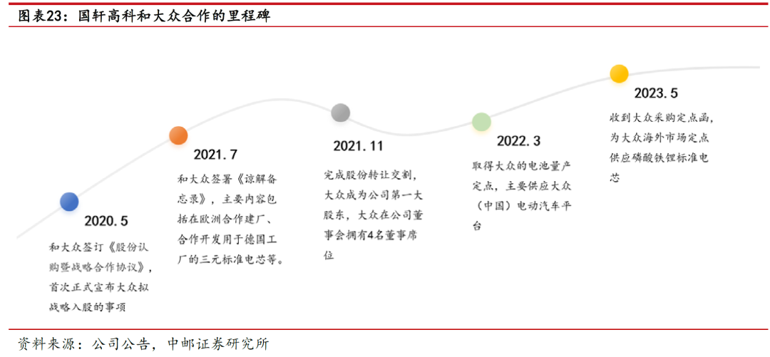 合作重点(3):完成大众国内、海外市场的电池量产定点。2022、2023年,国轩陆续取得了大众在中国市场和海外市场动力电池的定点,标志着公司的产品已经通过了大众的各维度检验检测,已拿到了量产的许可函。