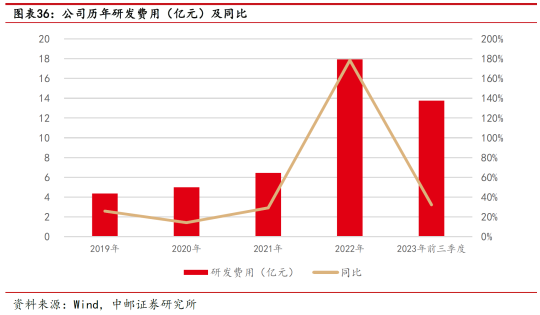 研发投入维持高位,加大技术创新力度。公司历年研发投入保持高位,2022年研发费用投入约18亿元,同比增长178%。研发投入力度进一步加强,大力开展新产品技术创新。