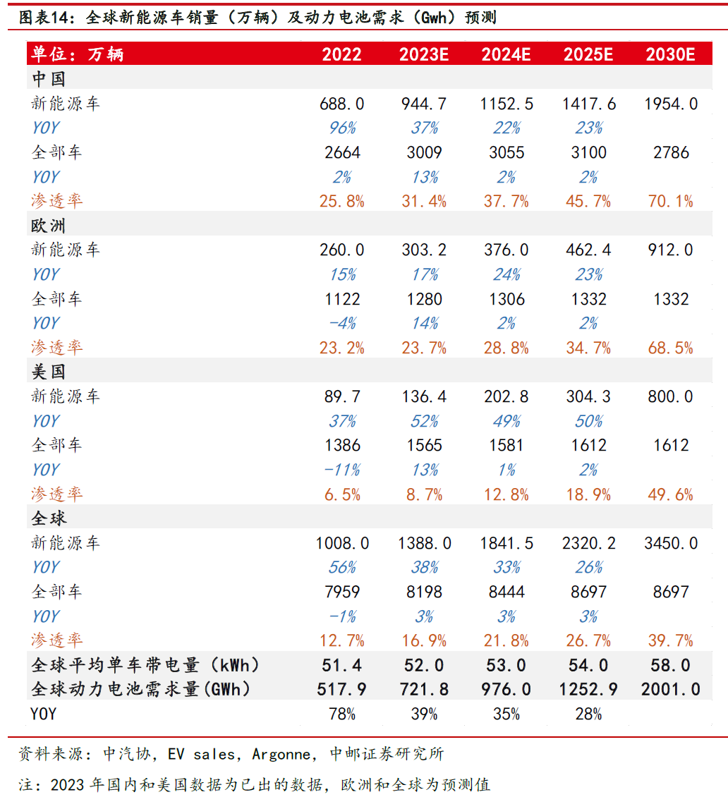 预计2025年全球动力电池需求超过1250Gwh。在全球多地政府政策的大力支持下,中国、欧洲、美国、东南亚等多地电动化发展趋势明朗。我们测算,到2025年,全球新能源车销量有望超2300万辆,动力电池需求有望超过1250Gwh。