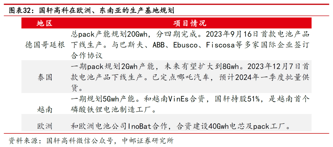 欧洲、东南亚市场深度合作当地企业,并陆续已实现电池的本地化生产。此外,在欧洲和东南亚地区,国轩不断开拓取得佳绩。欧洲,和当地电池公司InoBat合资建设40Gwh产能;在德国哥廷根,2023年实现首款德国产电池产品下线。泰国一期规划2Gwh产能,定点哪吒等车型,预计2024Q1开始供货。越南市场,和当地VinEs公司合资共建磷酸铁锂电池工厂。
