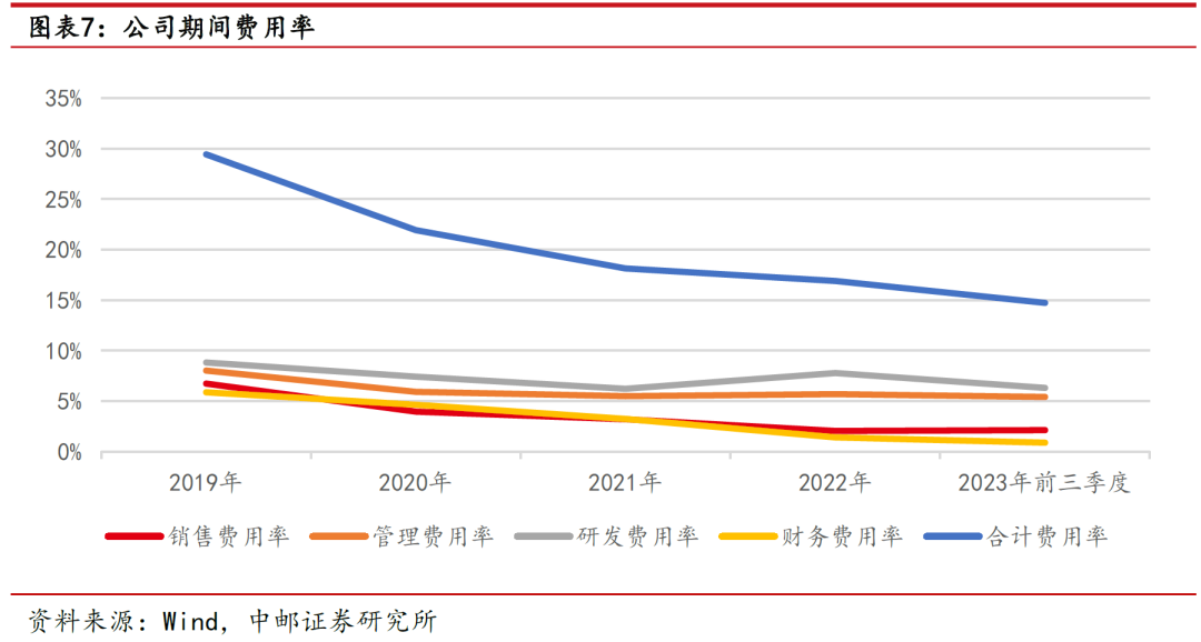 期间费用率有效控制,相比前几年已大幅下降。2019年/2020年/2021年/2022年/2023年前三季度,公司四大期间费用率总额分别为29%/22%/18%/17%/15%,费用率得到有效控制,其中财务和销售费用的降幅较大。研发费用方面,公司保持高研发投入,研发费用率目前在6%以上。