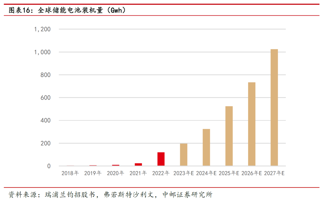 全球储能电池2027年装机有望超1000Gwh。据弗若斯特沙利文数据,2023年全球储能电池装机量有望达到约200Gwh,到2027年有望达到1023Gwh,复合增速超40%。