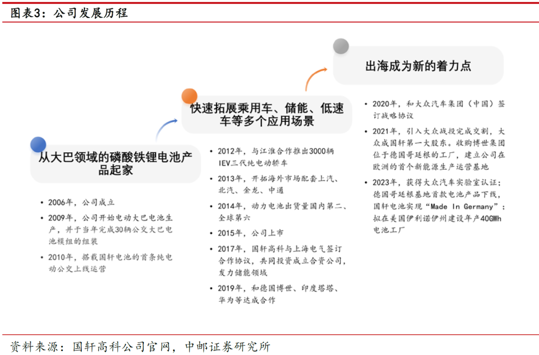 回顾公司发展历程,已完成“单一产品——横纵向延伸——全球化出海”的三级跳。公司最早由磷酸铁锂电池产品起家,最早应用于电动大巴领域,随后逐步拓展延伸至乘用车、低速车、储能等多个应用场景,实现下游应用的多维度拓展。此外,在产品结构上,公司也实现了磷酸铁锂和三元双路线的布局。2020年,公司和大众达成深度战略合作,并在之后陆续完成了大众的战略入股、大众标准电芯的定点等多项里程碑性质的推进动作。近两年,公司加大出海力度,剑指全球化锂电领军企业发展目标,在欧洲、美国等多地规划海外生产基地。