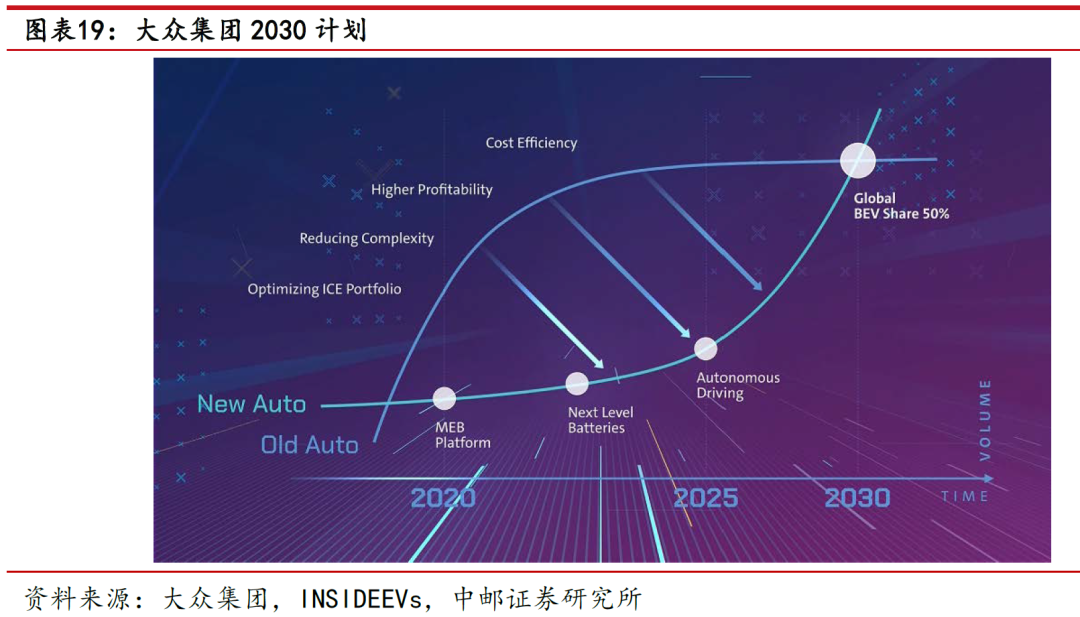 油车时代王者向电动化全力冲击,计划2030年纯电车销售比例超50%。2021年7月13日,大众汽车集团发布2030 NEW AUTO战略。到2030年,大众集团在全球销售的车型中,纯电动车的比例将上升到50%。到2040年,集团在全球主要市场的所有新售车辆将接近零排放。最迟到2050年,集团将实现碳中和。燃油车时代的全球龙头加入电动化的时代浪潮,大力转型,远期目标坚定而又明确。2022年,大众集团全球销量约830万辆,按此数据粗略测算,如果纯电车销量占比要超50%,到2030年纯电车年销量有望超400万辆。