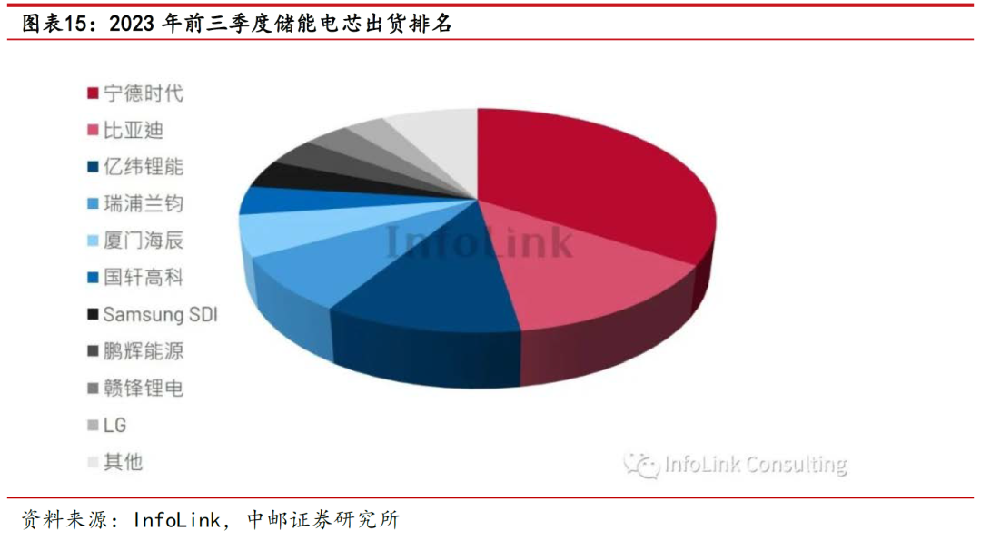 公司储能电芯出货量位列全球第六。储能领域,2023年前三季度全球储能电芯出货规模达143.8 GWh,其中大储、户储(含通信)分别为122.2 GWh与21.6 GWh,公司位列全球储能电芯出货第六名。