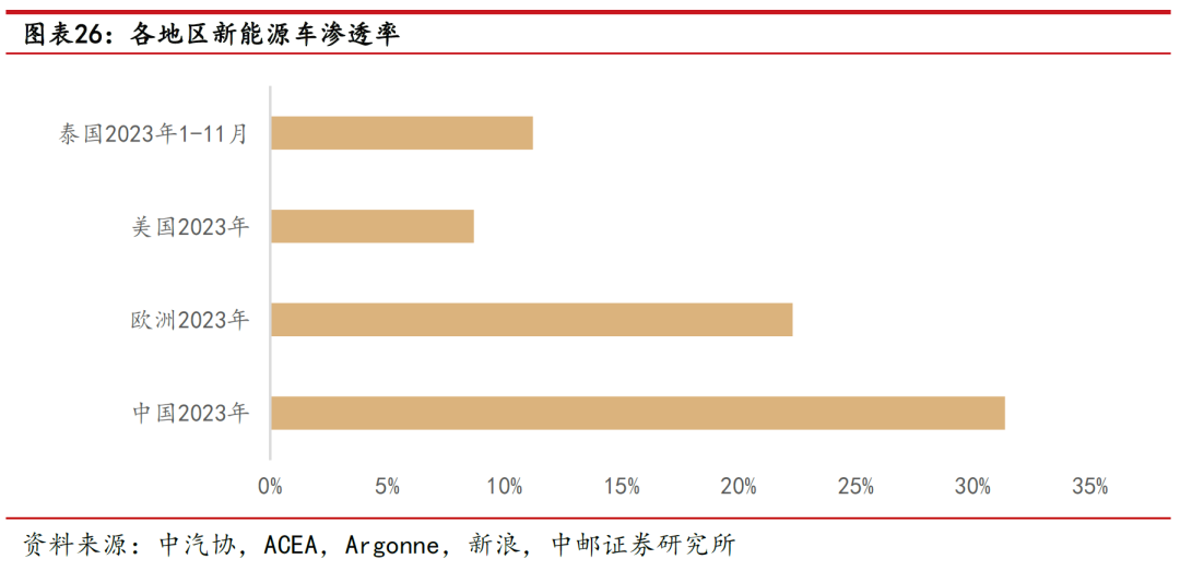 海外新能源车市场渗透率远低于国内,部分渗透率还在10%。海外市场对于国内的电池厂具有很大的价值。从渗透率来看,2023年中国新能源车渗透率已经超过了30%,而欧洲的渗透率才刚超过20%,美国和泰国(1-11月份数据)的渗透率在10%左右。