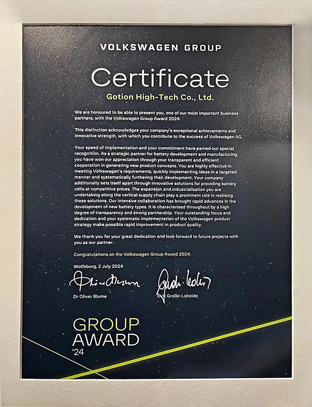 本次大会,大众汽车集团对过去一年中表现突出的十大门类供应商,进行表彰并颁发“大众集团奖(VolkswagenGroup Award 2024)”,其中仅有4家供应商入围电池品类最佳供应商“决赛圈”。国轩高科凭借先进的电池技术、卓越的产品质量,以及和大众的长期战略合作,脱颖而出,荣获大奖。