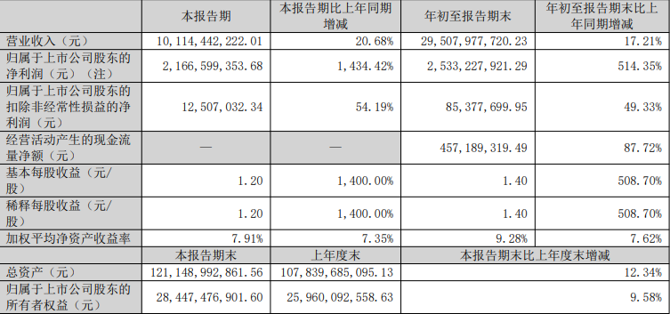 国轩高科第三季度单季归属上市公司股东净利润21.67亿元,同比暴增1434%,背后是早期持有的奇瑞汽车股份因港股上市导致公允价值大幅变动。