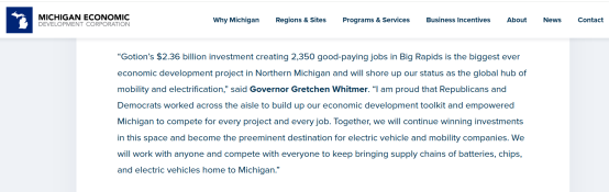 对于密歇根这个因汽车工业辉煌、却因制造业外迁而衰落的州,它也被寄予“经济救赎”的厚望。密歇根州州长格雷琴·惠特默(Gretchen Whitmer)在2022年10月的声明中称:“我们将共同继续赢得该领域的投资,并成为电动汽车和移动公司的卓越目的地。”