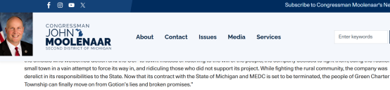 代表密歇根州大片农村地区的共和党美国众议员约翰·穆勒纳尔(John Moolenaar)曾是该项目最响亮、最突出的批评者,“现在它与密歇根州和MEDC的合同即将终止,绿镇人民终于可以摆脱国轩的谎言和违背承诺。”他提到。