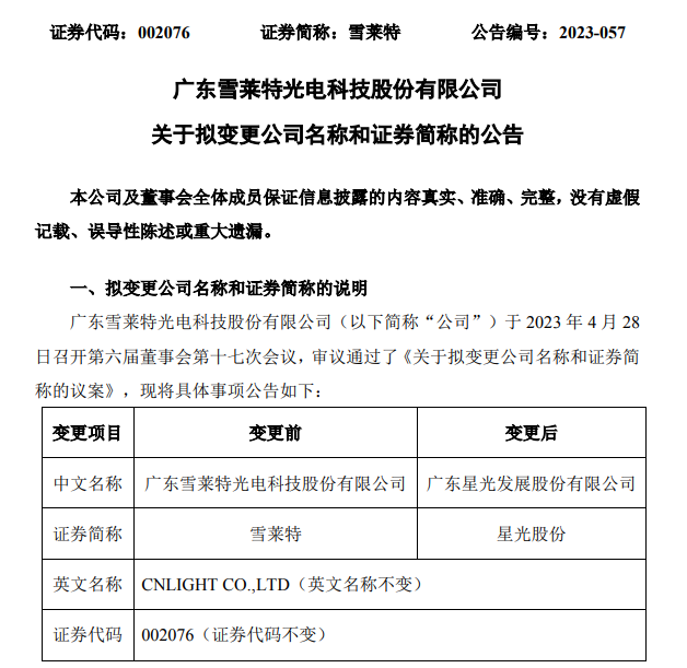 4月28日,广东雪莱特光电科技股份有限公司(以下简称“雪莱特”)董事会审议通过了《关于拟变更公司名称和证券简称的议案》,拟将公司名称由“广东雪莱特光电科技股份有限公司”变更为“广东星光发展股份有限公司”,证券简称拟更名为“星光股份”。