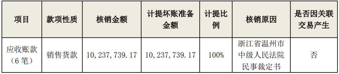认无法收回的 6 笔应收账款,金额共计 10,237,739.17 元予以核销。本次核销的应收账款情况如下:
