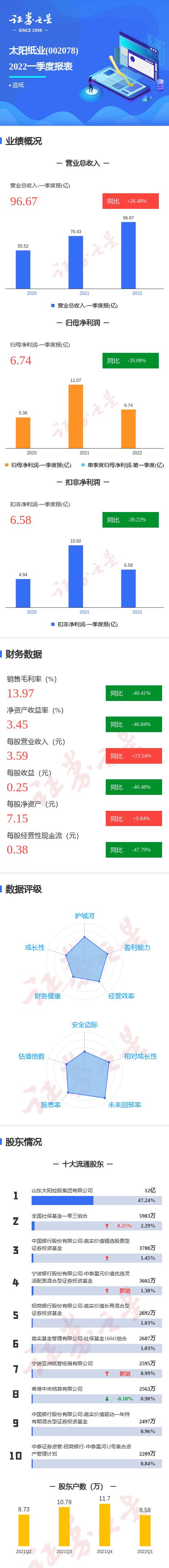 太阳纸业2022一季报显示,公司主营收入96.67亿元,同比上升26.48%;归母净利润6.75亿元,同比下降39.08%;扣非净利润6.58亿元,同比下降39.22%;其中2022年第一季度,公司单季度主营收入96.67亿元,同比上升26.48%;单季度归母净利润6.75亿元,同比下降39.08%;单季度扣非净利润6.58亿元,同比下降39.22%;负债率56.19%,投资收益469.88万元,财务费用1.29亿元,毛利率13.97%。