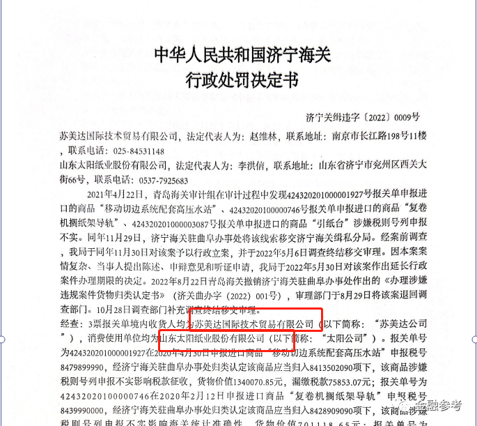 据此,11月18日,济宁海关依据《中华人民共和国海关法》第八十六条第三项、《中华人民共和国海关行政处罚实施条例》第十五条第一项及第四项的规定,对太阳纸业作出罚款2.3万元的行政处罚决定,并予以警告处分。同时,济宁海关对苏美达公司处以罚款0.1万元。