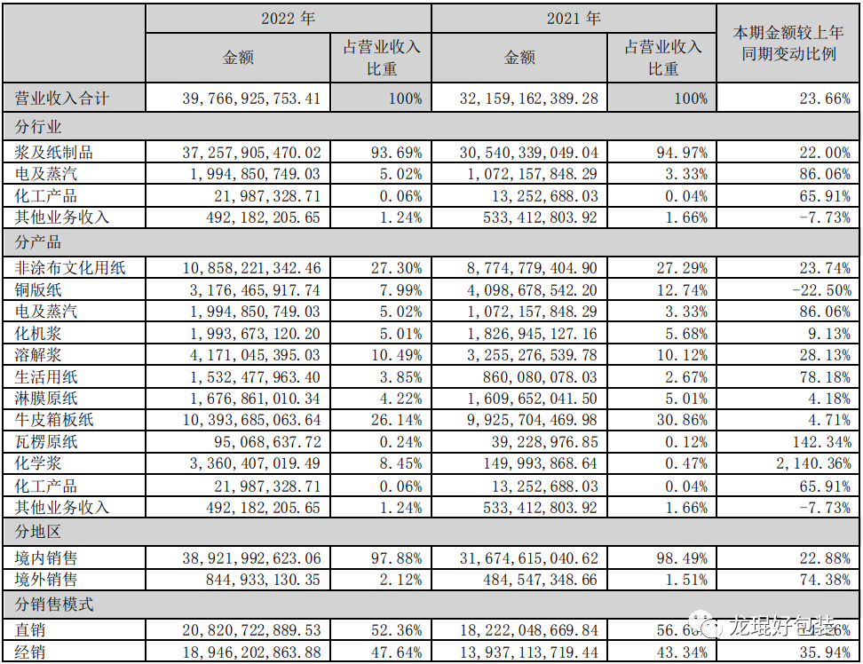 近日,山东太阳纸业股份有限公司(下文简称:太阳纸业)公布2022年年度报告。报告期内,该公司实现营收397.67亿元,同比增长23.66%;归母净利润为28.09亿元,同比下降4.12%。纸、浆合计产能已超过1000万吨。