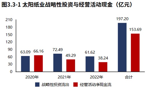 自身造血能力无法覆盖有所降低的战略性投资。太阳纸业2022年报战略投资资金流出61.62亿元,较2021年报减少10.87亿元,增速-14.99%,战略性投资的资金投入有所降低。太阳纸业2020年报到本期战略投资资金流出197.20亿元,经营活动产生现金净流入153.69亿元,经营活动的造血能力无法覆盖战略投资的资金流出。