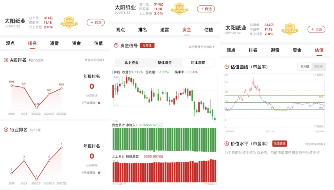 截至2022Q3,太阳纸业在A股的整体排名上升至第658位,在造纸行业中的排名上升至第1位。截止2023年4月26日,北上资金并无特别信号。以近三年市盈率为评价指标看,太阳纸业估值曲线处在偏低区间。