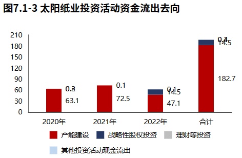 投资流出减少,主要流向了产能建设和战略性投资。太阳纸业2022年报的投资活动资金流出,产能建设占比最大,占比76.38%。太阳纸业2020年报到本期的投资活动资金流出,集中在产能建设,占比92.35%。