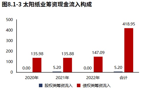 2022年报太阳纸业筹资活动现金流入158.01亿元,其中股权流入0.00元,债权流入147.09亿元,债权净流入24.91亿元,公司的生存发展仍对贷款有一定依赖。