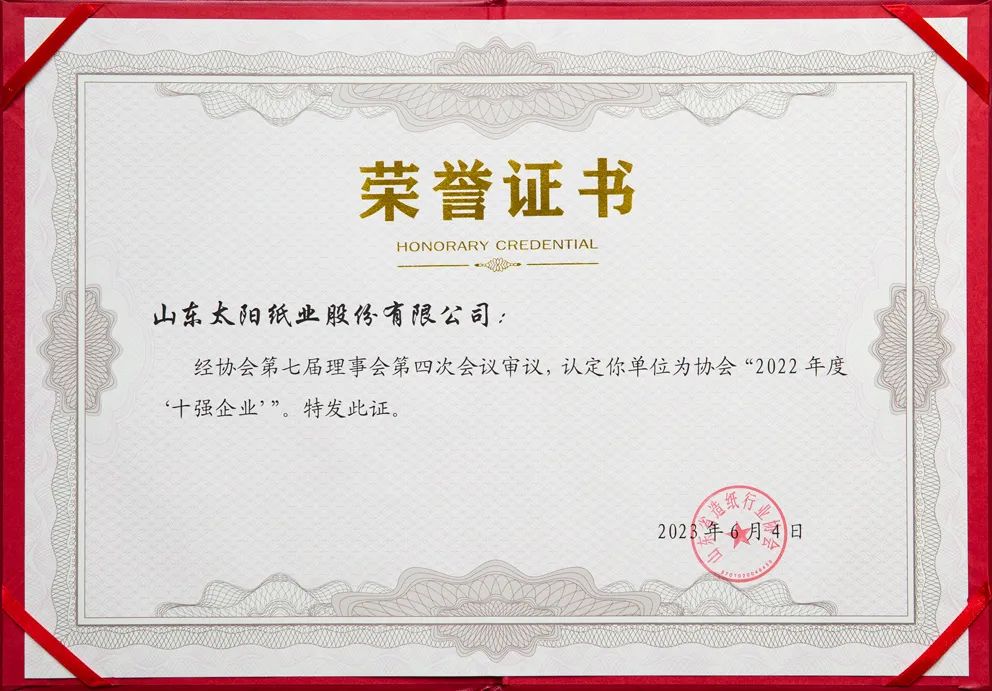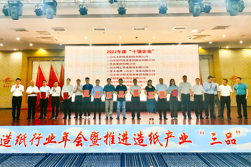 在颁奖环节,齐鲁工业大学副校长、山东造纸学会理事长刘玉教授宣读了《关于公布协会认定2022 年度“十强企业”的通报》,山东太阳纸业股份有限公司等十家企业被认定为山东省造纸行业协会“2022 年度‘十强企业’”。
