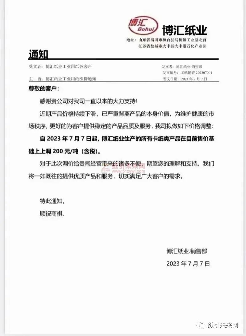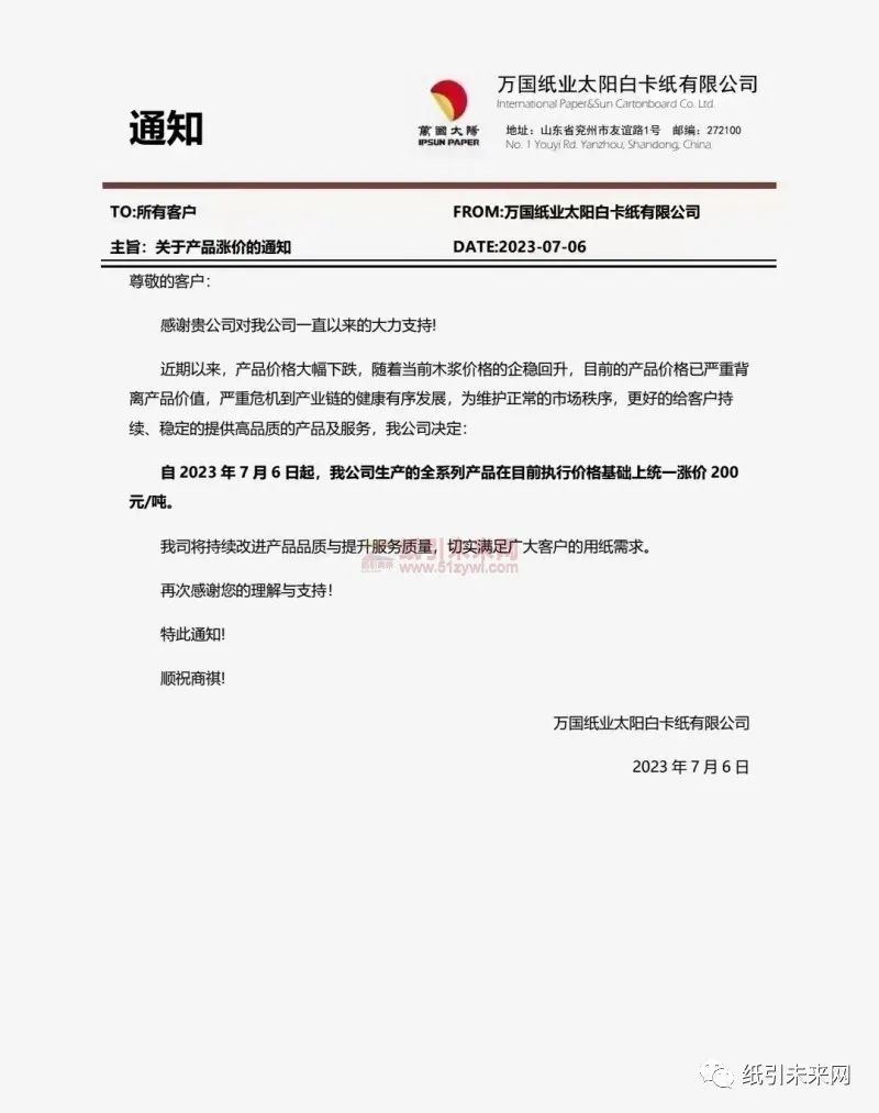 万国纸业太阳白卡纸有限公司:近期以来,产品价格大幅下跌,随着当前木浆价格的企稳回升,目前的产品价格已严重背离产品价值,严重危机到产业链的健康有序发展,为维护正常的市场秩序,更好的给客户持续、稳定的提供高品质的产品及服务,我公司决定:自2023年7月6日起,我公司生产的全系列产品在目前执行价格基础上统一涨价200元/吨。