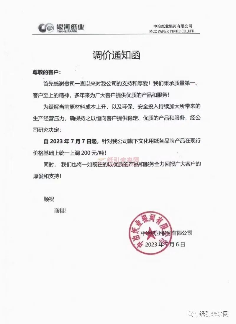 中冶纸业银河有限公司:为缓解当前原材料成本上升,以及环保、安全投入持续加大所带来的生产经营压力,确保持之以恒向客户提供稳定、优质的产品和服务,经公司研究决定:自2023年7月7日起,针对我公司旗下文化用纸各品牌产品在现行价格基础上统一上调200元/吨!