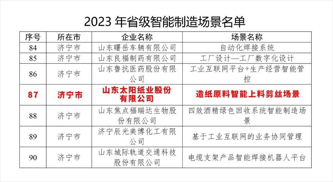 本月,山东省工业和信息化厅公布2023年山东省级智能工厂、数字化车间、智能制造场景和系统解决方案供应商名单,公司“造纸原料智能上料剪丝场景”成功入选2023年省级智能制造场景。