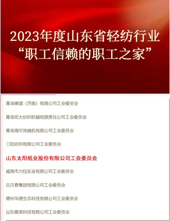 近日,山东省总工会公布2023年度山东省轻纺行业“职工信赖的职工之家”“职工信赖的娘家人”名单,其中山东太阳纸业股份有限公司工会委员会荣获2023年度山东省轻纺行业“职工信赖的职工之家”称号。
