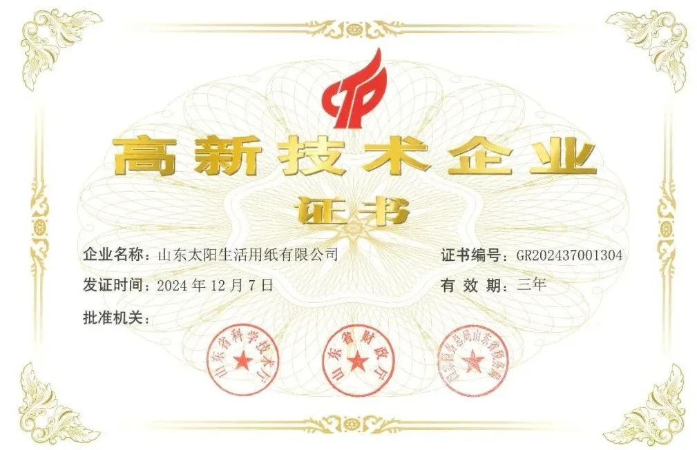 日前,山东省科技厅、山东省工业和信息化厅、山东省财政厅、国家税务总局山东省税务局发布《关于公布山东省2024年度高新技术企业名单的通知》,经省高新技术企业认定管理机构组织企业申请、专家评审等程序,并经全国高新技术企业认定管理工作领导小组办公室公示与备案,公司子公司山东太阳生活用纸有限公司、兖州天章纸业有限公司荣获“国家高新技术企业”认证!