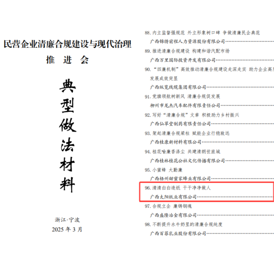3月26日,全国工商联民营企业清廉合规建设与现代治理推进会在浙江宁波鄞州举行。其中,广西太阳纸业有限公司清廉建设工作取得的扎实成效受到高度认可,《清清白白造纸干干净净做人》成功入选本次推进会典型做法交流材料。