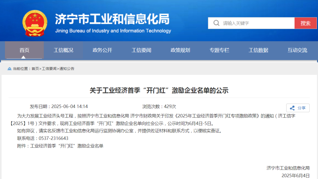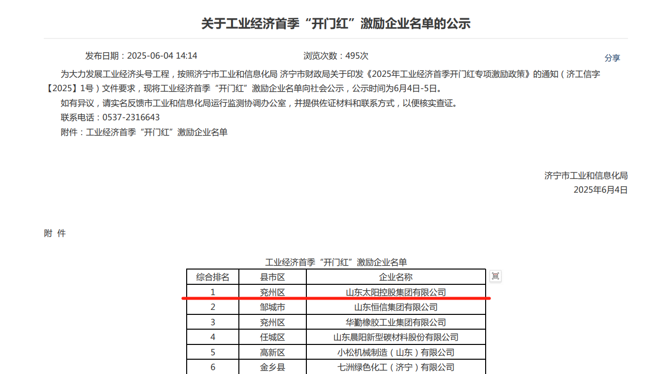 近日,济宁市工业和信息化局公示了工业经济首季"开门红"激励企业名单,公司控股股东山东太阳控股集团有限公司成功入选。