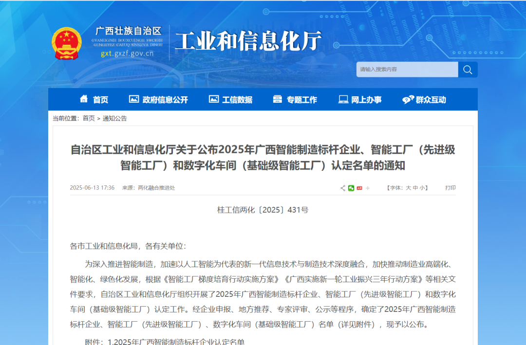 6月13日,广西壮族自治区工业和信息化厅正式发布2025年广西智能制造标杆企业、智能工厂(先进级智能工厂)及数字化车间(基础级智能工厂)认定名单,广西太阳纸业有限公司成功入选智能工厂(先进级智能工厂)名单!