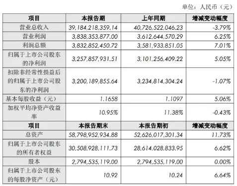 本报告期,实现营业总收入 3.918.421.84 万元,比去年同期减少 154.230.37万元,同比降低 3.79%;实现营业利润 383.835.39 万元,比去年同期增加22.570.93 万元,同比增长 6.25%;利润总额为 383.285.25 万元,比去年同期增加 25.091.86 万元,同比增长 7.01%;归属于上市公司股东的净利润为325,785.79万元,比去年同期增加15,660.15万元,同比增长5.05%。基本每股收益1.1658元,比去年同期增加0.0561元,同比增长5.06%。