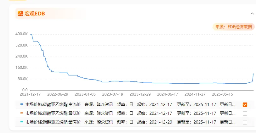 VC涨价主要受动力电池、储能市场需求驱动影响,VC价格自2025年9月低点反弹超23%,供需紧平衡状态延续。