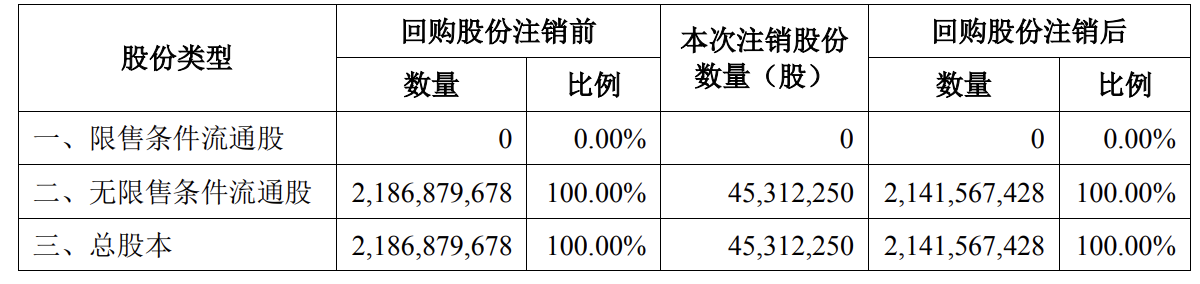 本次部分回购股份注销前,公司回购专用证券账户累计持有公司股份114,772,158股,占公司总股本的5.25%。